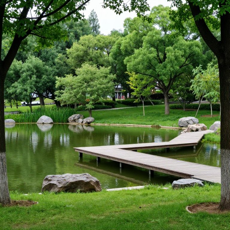 Photograph of a serene park with a wooden dock extending over a calm pond, surrounded by lush green trees, grass, and scattered rocks.