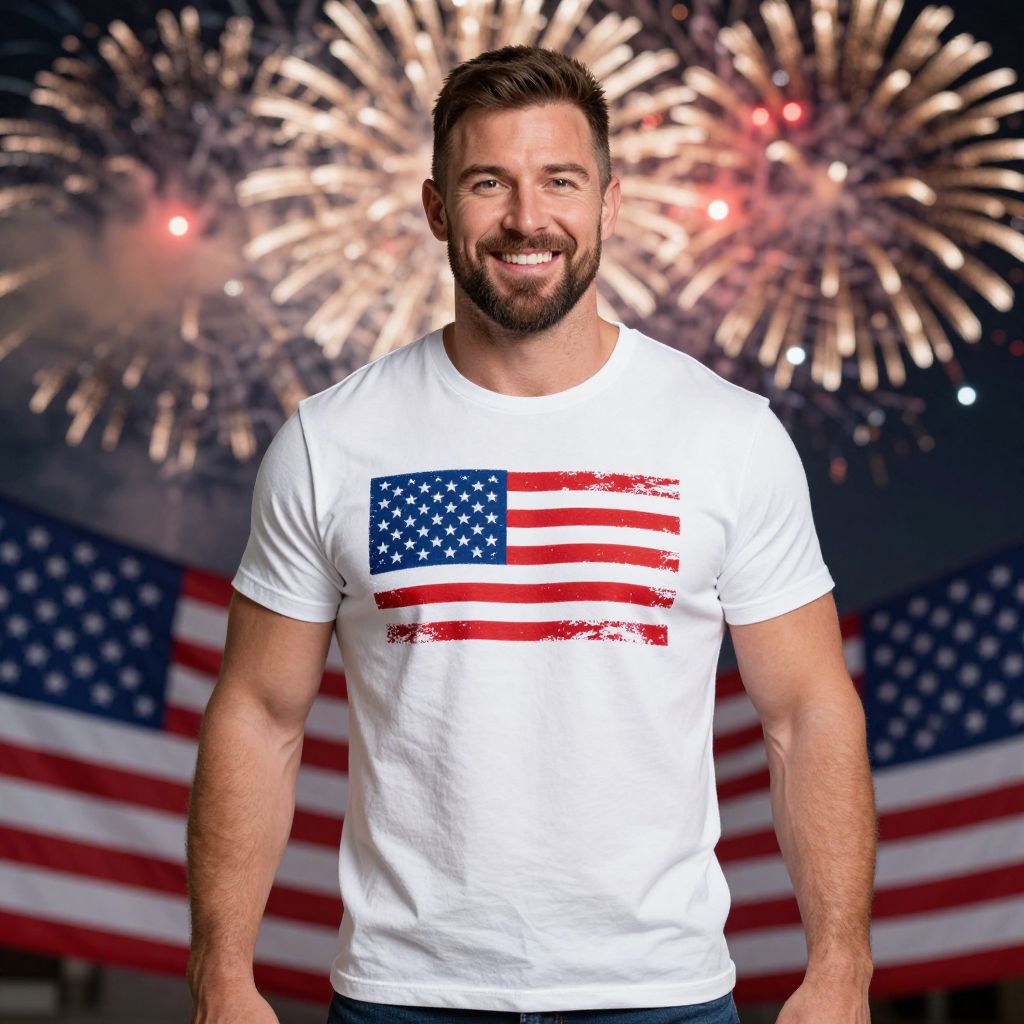 Photograph of a smiling, muscular man with short brown hair and a beard, wearing a white t-shirt with a red and blue American flag design on the chest. The background features vibrant fireworks and two American flags. The man's confident stance and the colorful fireworks create a patriotic, celebratory atmosphere. The image is well-lit, emphasizing his strong, healthy appearance.