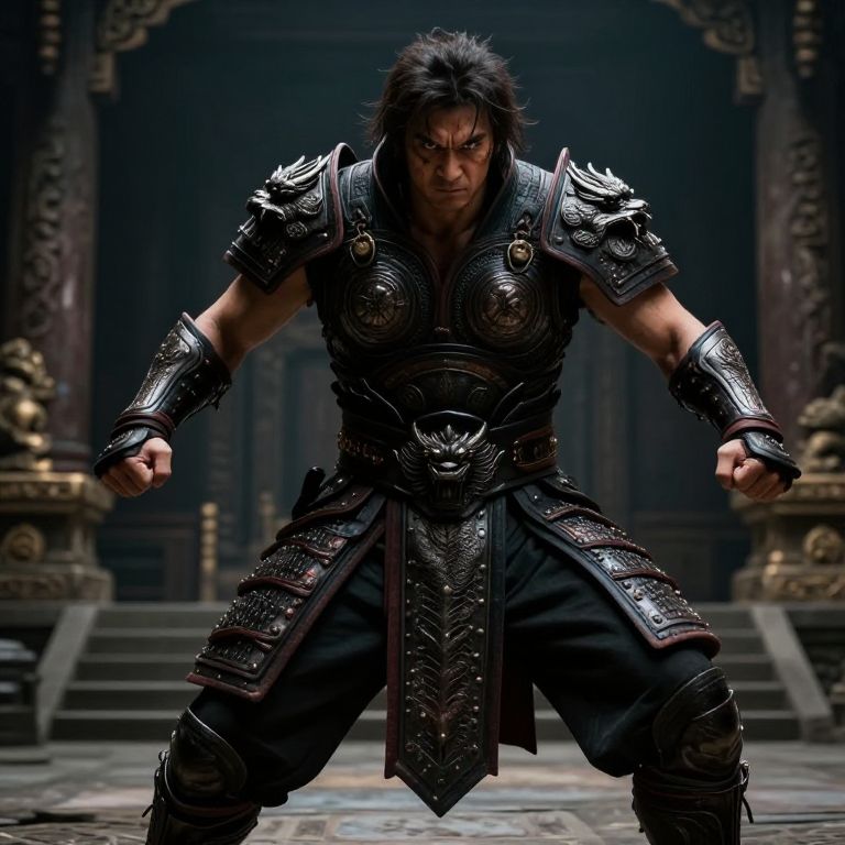 Mortal Kombat OC maker theme, fierce custom warrior design in dark, gritty style, intricate armor with dragon motifs, intense battle stance, realistic textures, moody lighting, ancient temple background, cinematic and dynamic composition.