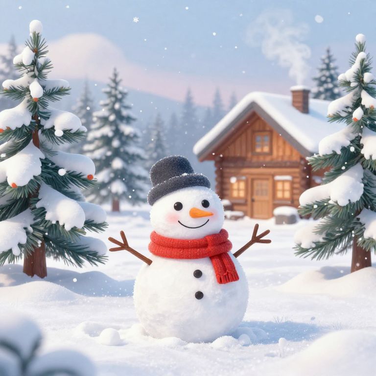 Classic bonhomme snow character in a winter wonderland, surrounded by pine trees dusted with snow and falling snowflakes, cozy cabin in background with smoke from the chimney, soft pastel color palette and gentle lighting effect.