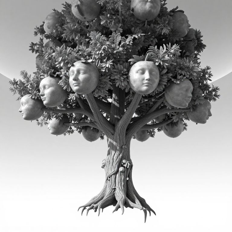 A surreal monochrome 3D render depicts an inverted tree growing from a mirrored sky, its branches adorned with fruit-like faces of forgotten dreamers, rendered in high-definition detail with dramatic lighting that accentuates the ethereal and otherworldly atmosphere.