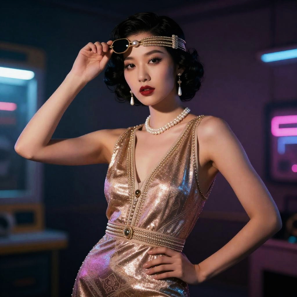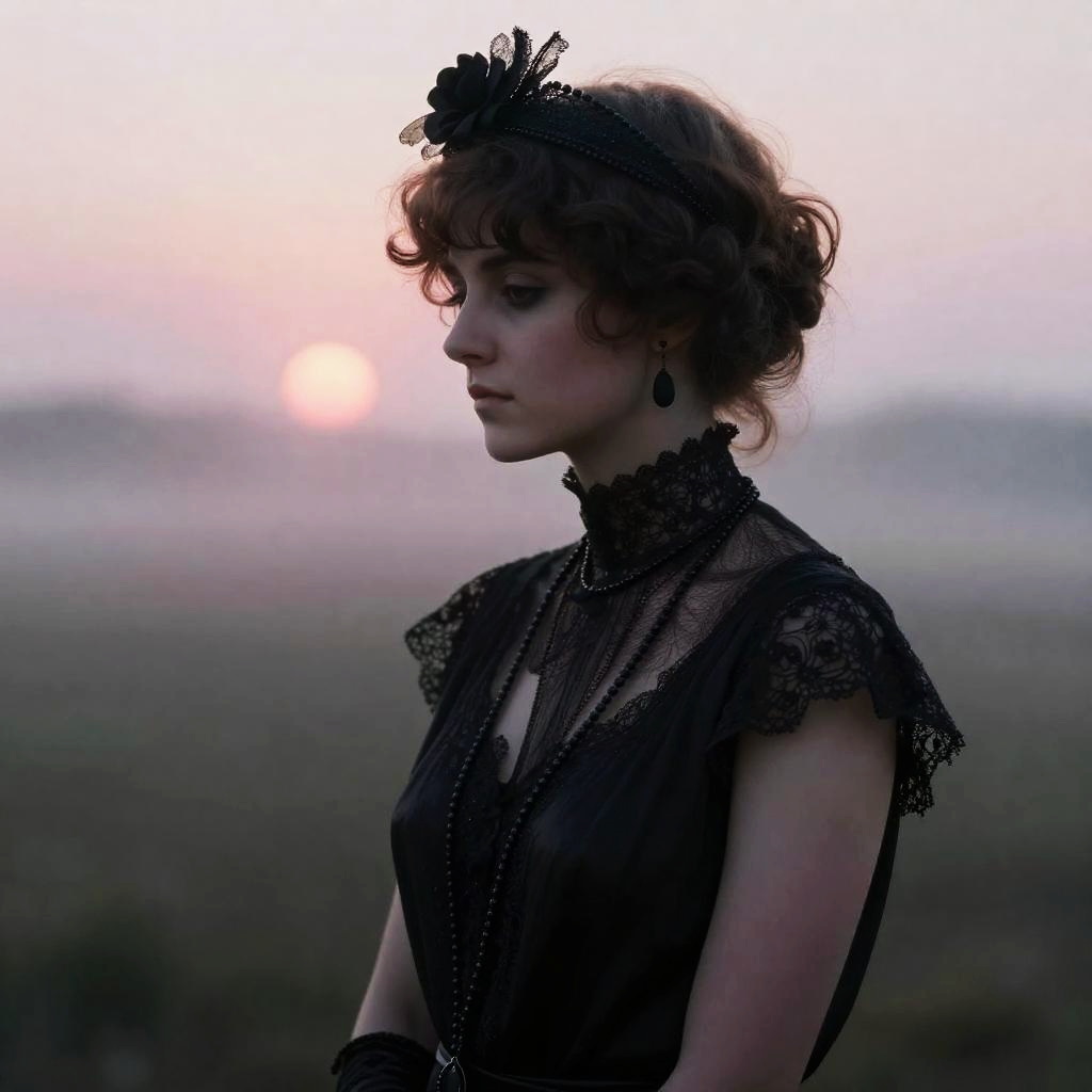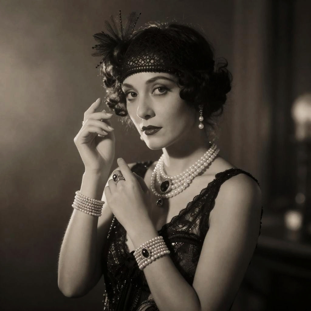 A Belle Époque actress depicted in a film noir pastiche aesthetic, merging elegance with a wistful glamour vibe, featuring intricate details and a smoky sepia dream atmosphere.