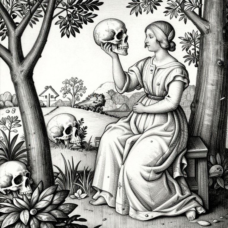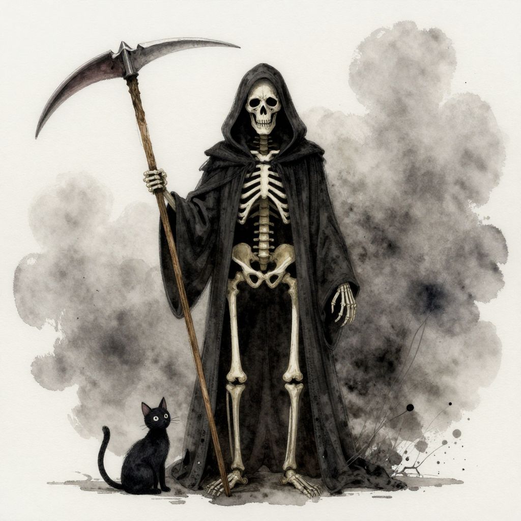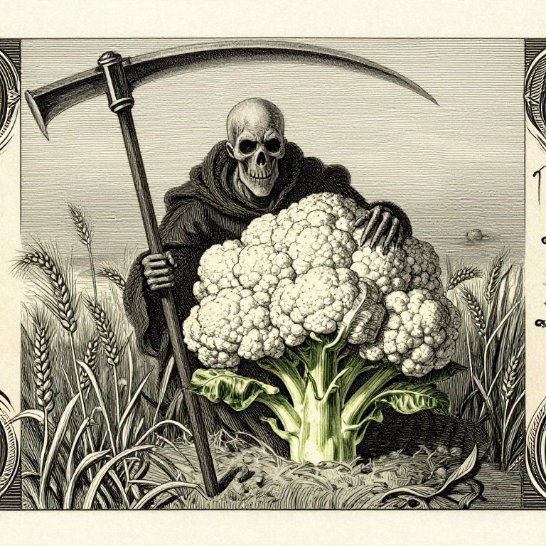 Cauliflower Effect grim reaper with scythe in barley field, lithograph, ornate, style of paper currency,