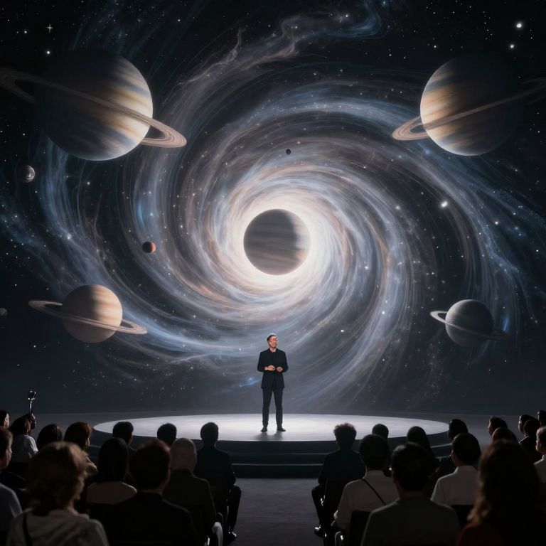 A visionary speaker stands before an audience beneath a cosmic vortex, where planets float serenely in a swirling expanse of light and shadow, defying gravity and reality alike.