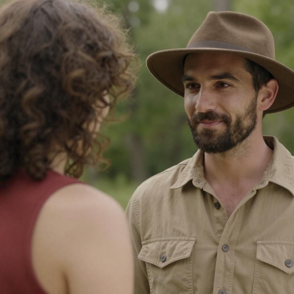A man and a woman sit together on a tree branch in a dense forest. The man has a dark beard, wears a white shirt, black pants, and a black wide-brimmed hat. He looks off to the side with a serious expression. The woman has blonde hair, a light blue shirt, and black pants, holding a camera with a brown strap around her neck, gazing upwards with a curious look. Sunlight filters softly through the surrounding leaves, creating a natural outdoor atmosphere.
