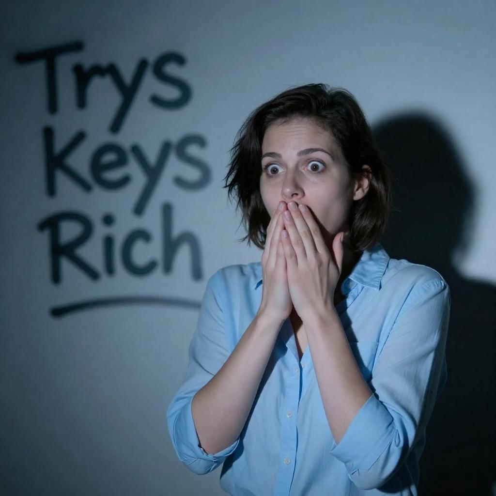 Photograph of a woman with short, dark hair and a light blue shirt, covering her mouth in a shocked expression. Her shadowed reflection is in the foreground. Graffiti on the wall behind her reads "Try's Keys Rich." Blue lighting.