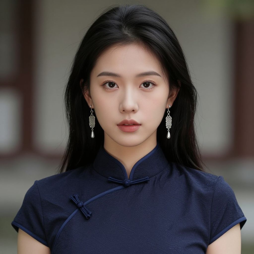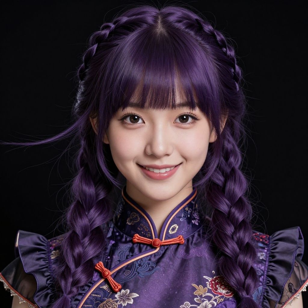 ((masterpiece, best quality, highres, realistic)) Perfect Face, (Realistic), masterpiece, cinematic lighting, natural shadow, highest detail, professional photography, detailed background, depth of field, insane details, intricate, aesthetic, detailed face, subsurface scattering, looking at viewer, Point-of-View Shot, 1girl, photo of a cute girl, full body, light smile, charming, 20yo, Dutch Braid Hair.Blunt bangs, Deep purple hair, black background centered china dress, Frill, Classic headshot pose, marvelous composition, cinematic atmosphere, spectacular, rich bright colors, elegant, dynamic, extremely detailed, professional, joyful, beautiful, surreal, contemporary, deep aesthetic, inspirational, gorgeous, sublime, amazing, creative, positive, awesome, pure, rational, shiny, glowing, attractive, lovely