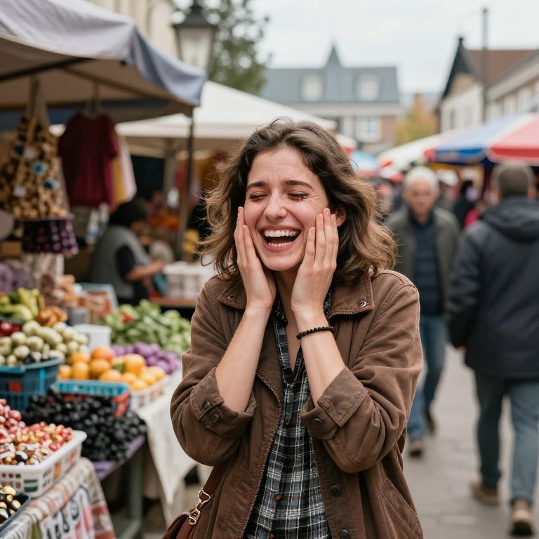 This photograph captures a joyful young woman with wavy brown hair and fair skin, standing at an outdoor market. She is laughing heartily, with both hands cupping her face. She wears a brown jacket over a black and white plaid shirt. The market stall behind her displays colorful fruits and vegetables, including green peppers, oranges, and grapes. The background shows blurred market-goers and tents with red and blue canopies. The street is wet, suggesting recent rain, and there are buildings with red and gray roofs in the distance. The overall scene is lively and bustling.