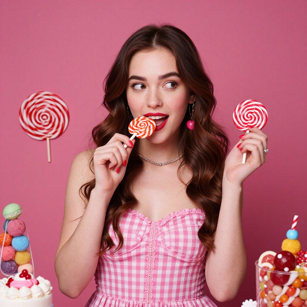 A woman with candy and sweets surrounding her, creating a vibrant and surreal scene.