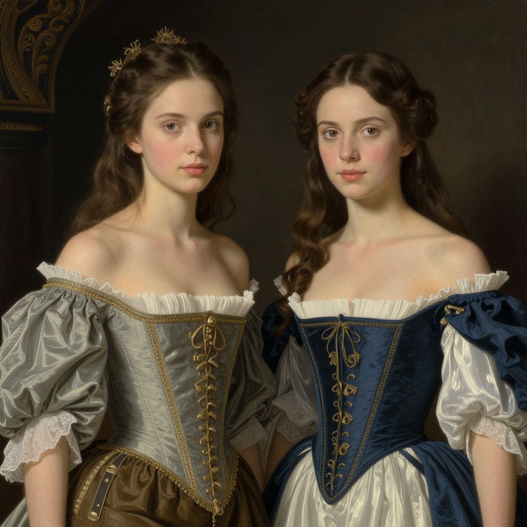 Photorealistic painting of two young, fair-skinned women with long brown hair, wearing off-shoulder Renaissance-style dresses in gray and blue,