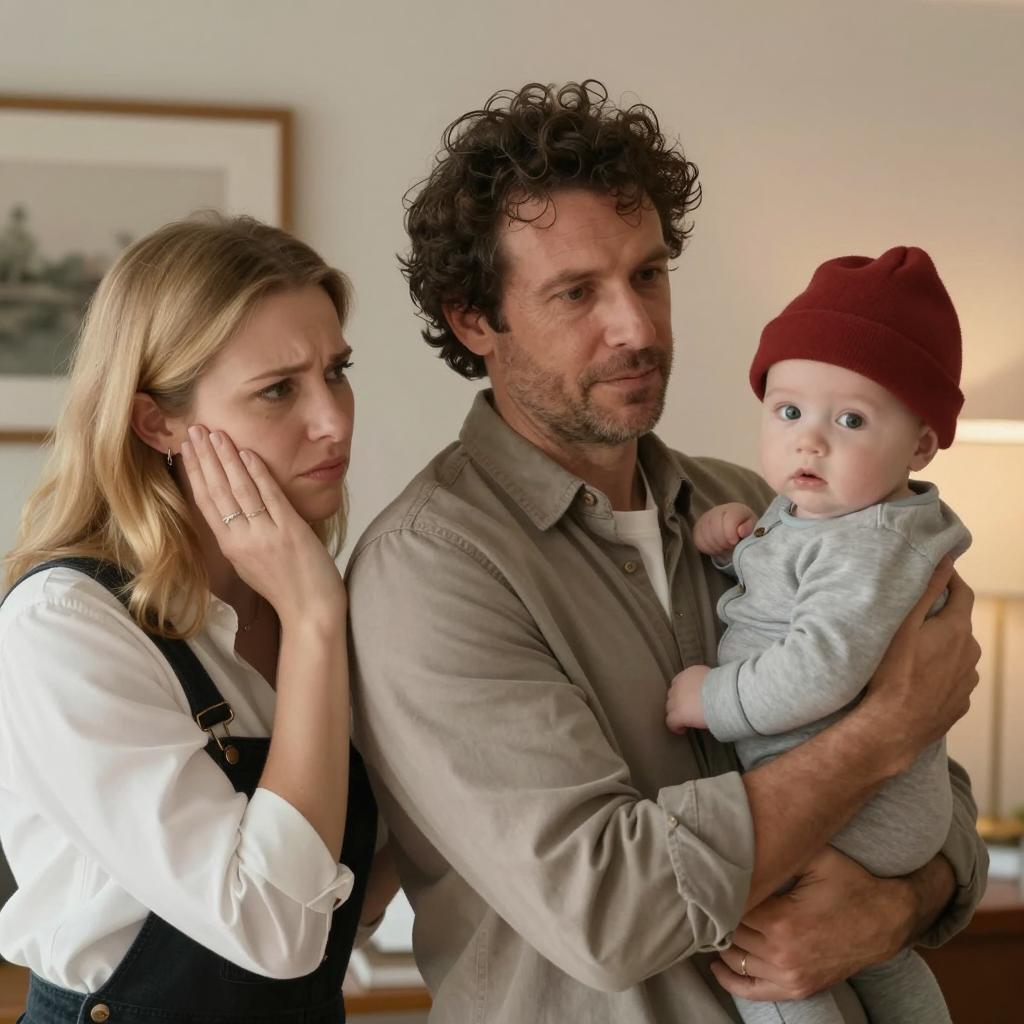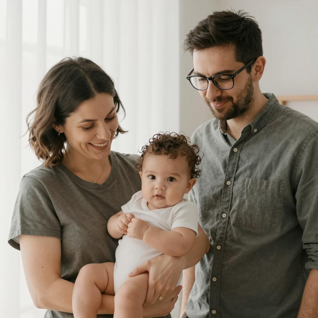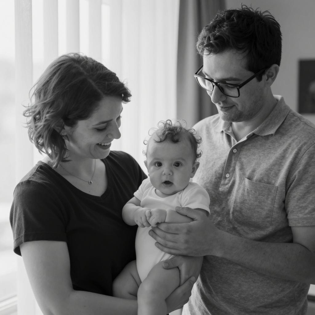 Photograph of a family in a picture frame. Four people: father with curly hair and slight beard, mother with dark hair and light skin, son with short brown hair, and younger son with short hair. Father and mother smile at the camera, arms around son and younger son. Background is dark. Other framed photos to the left and right.