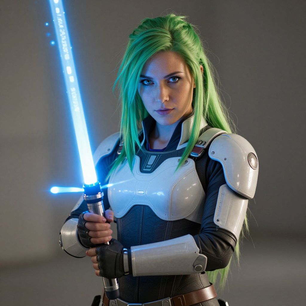 Otaku realistic image of a women jedi, with green hair, blue lightsaber, cyberpunk suit, natural light cinematic,