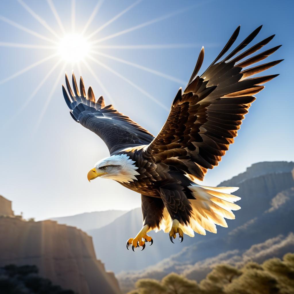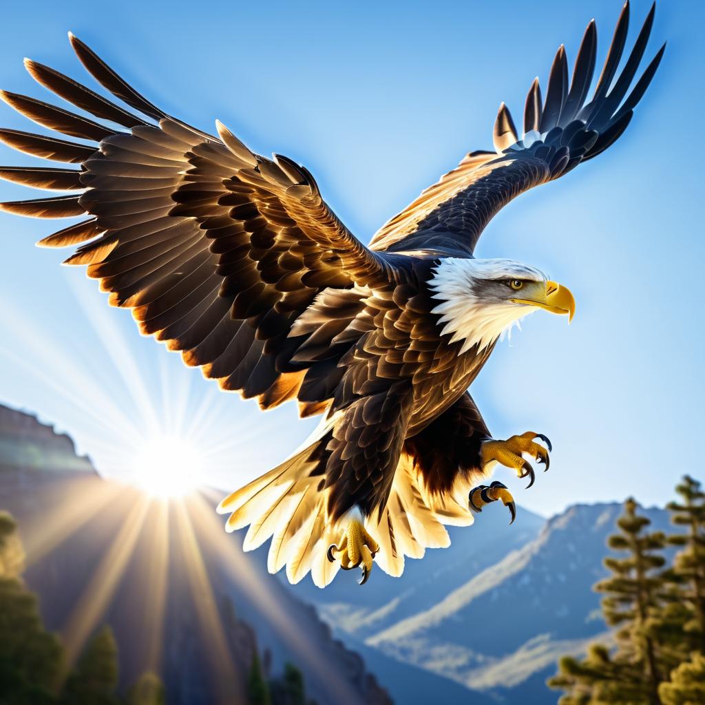 Photorealistic image of a bald eagle soaring with wings fully spread, illuminated by bright sunlight. The eagle is captured mid-flight above a mountainous landscape with clear blue skies, showcasing sharp details of the bird's feathers and intense gaze, shot with a 35mm lens.
