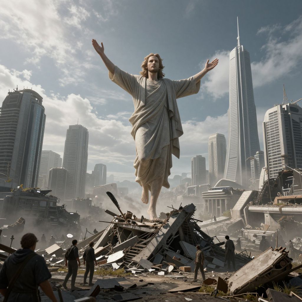 Digital artwork: Giant, smiling Jesus with outstretched arms stands on rubble in a destroyed cityscape, with skyscrapers in the background.