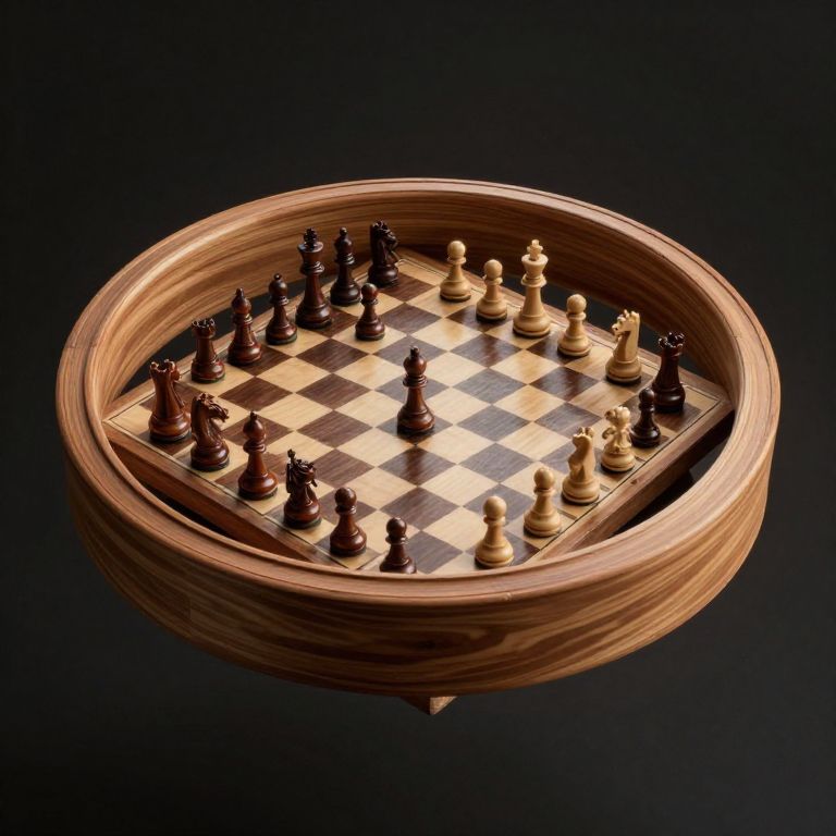 A surreal chessboard encased in a wooden Möbius strip rotates endlessly, defying conventional boundaries as pieces seem to vanish and reappear in impossible configurations.