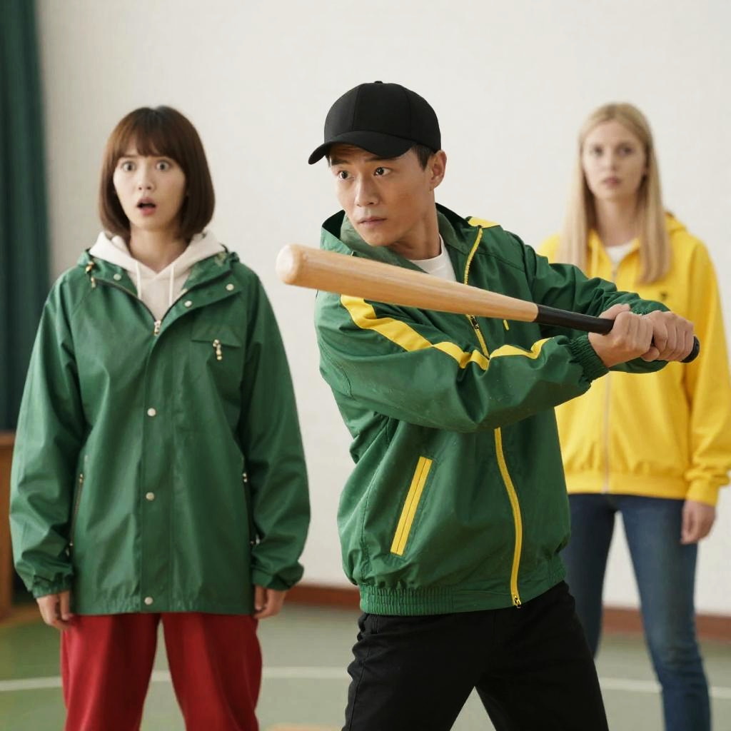 Photograph of a scene with three people. Central man in green jacket with yellow stripes, black cap, swinging wooden bat. Woman in green raincoat, red pants, shocked expression, stands left. Blonde woman in yellow top, background. Indoor setting.