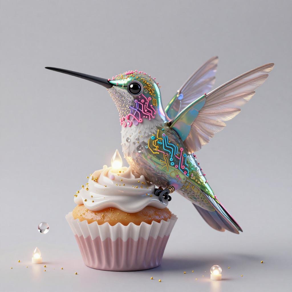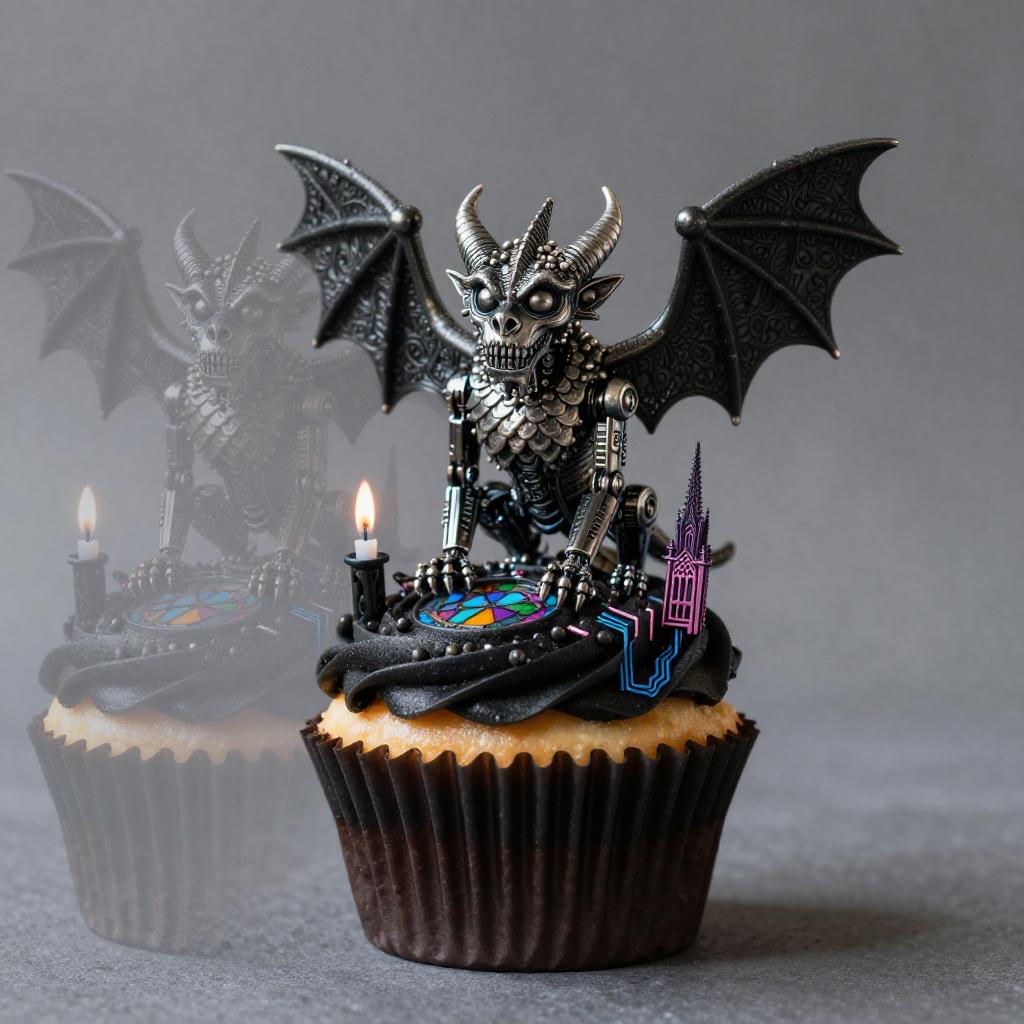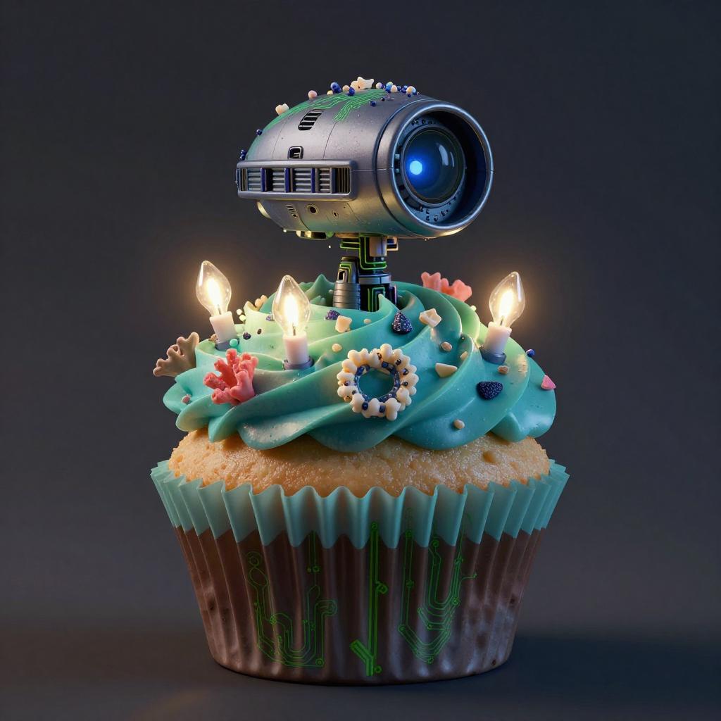 A high quality digital art of a Cupcake Abyssal deep-sea droid, phosphorescent coral-glaze frosting, crushed abalone-shell sprinkles, micro-pressure bulb LED candles, green and black circuits, double exposure, macro shot, (double exposure:1.05), mysterious theme, octane render, droid, scientific photo, 12k, moody lighting, minimalist composition, vibrant lighting, catalog photo