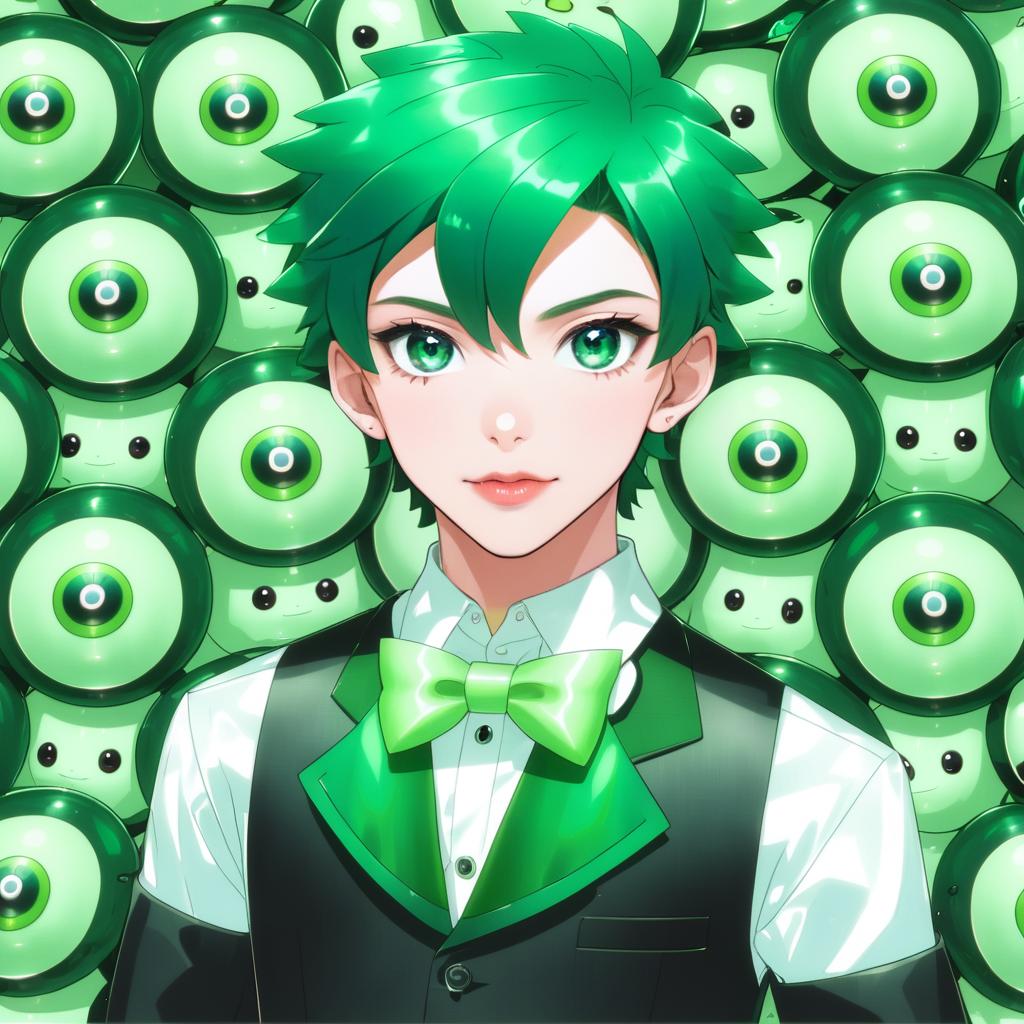 Anime-style illustration of a young male character with short green hair and striking green eyes. He is dressed in a formal outfit featuring a white long-sleeve shirt, black vest, black pants, and a green bowtie. The background is filled with multiple green, eye-shaped figures with black pupils, creating a vibrant and thematic composition. The art is inspired by anime aesthetics and features clean, sharp lines and bright colors.