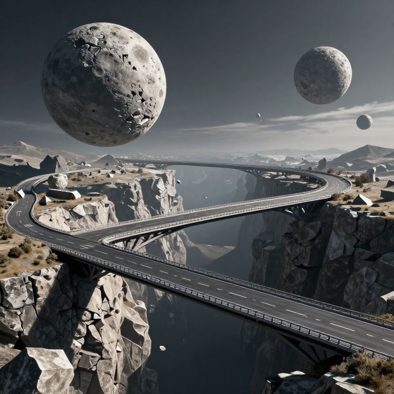 A surreal 3D-rendered landscape features gravity-defying bridges spanning vast chasms, connecting floating fragments of broken moons under dramatic lighting, creating a perilous yet ethereal highway through a fractured sky.