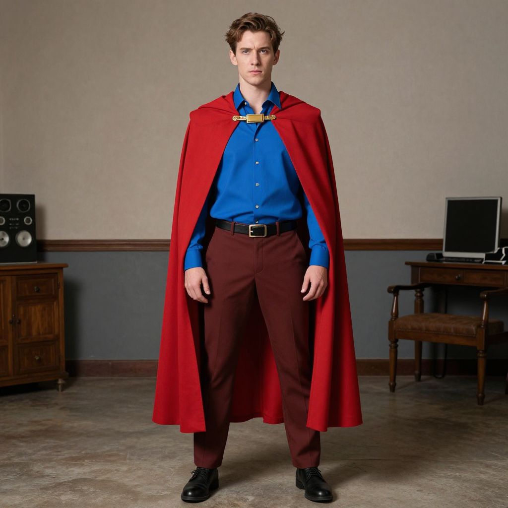 Show Character Costume, man in a red cape and blue shirt standing in a room