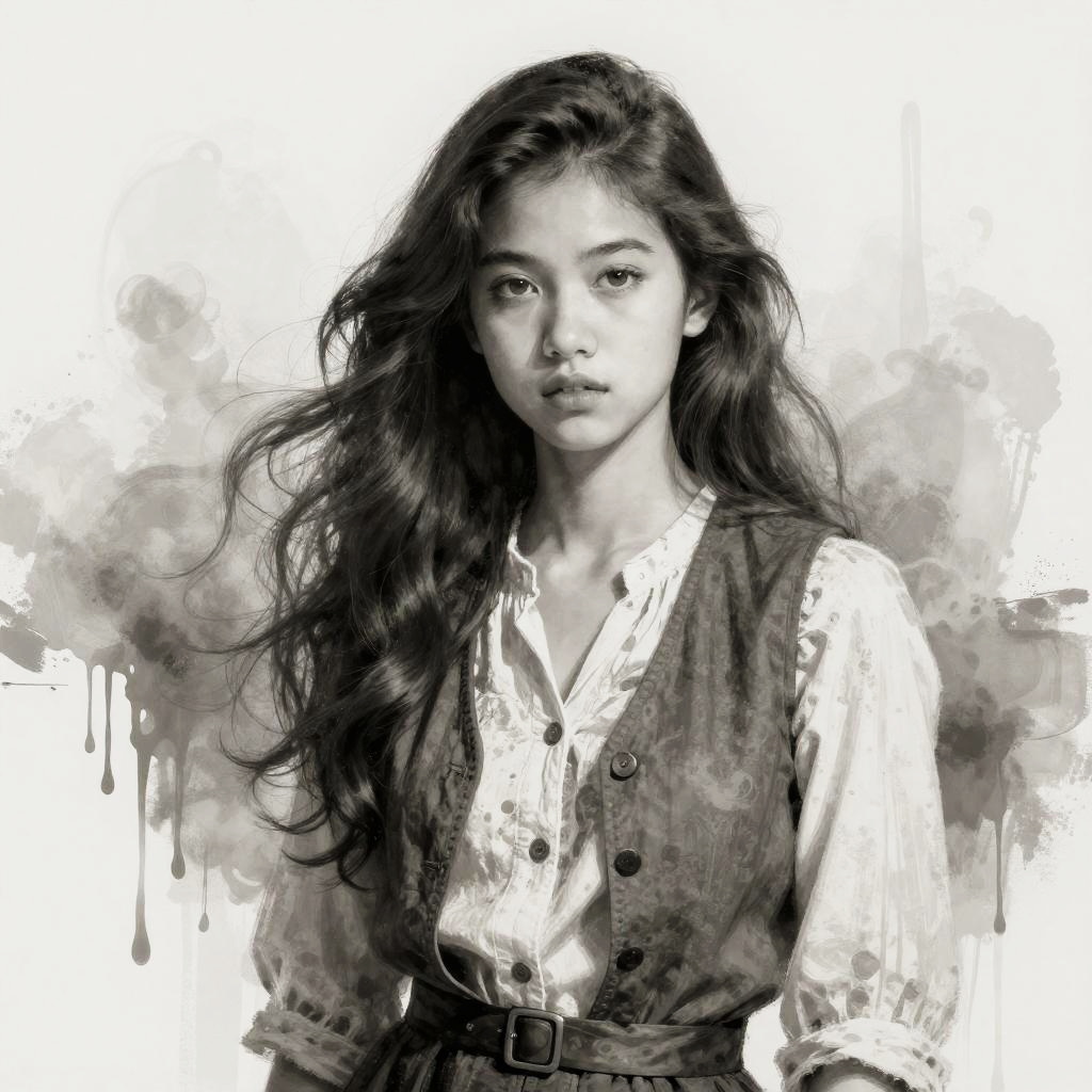 A digital artwork of a young woman with long flowing hair, dressed in a vintage-style blouse and vest. The monochrome piece features soft shading and a slightly abstract background with dripping paint effects, emphasizing a blend of realism and artistic expression.
