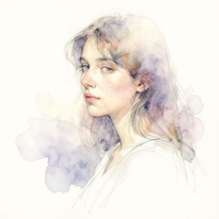 A digital watercolor-style portrait of a young woman with soft, delicate features. She has fair skin, light brown hair with subtle purple and blue hues, and blue eyes. Her expression is calm and introspective. She wears a white top, and the background is a blend of light purple and white, giving a dreamy, ethereal feel. The image uses soft, flowing lines and gentle color gradients, creating a delicate and ethereal atmosphere. The overall style is reminiscent of impressionistic painting.