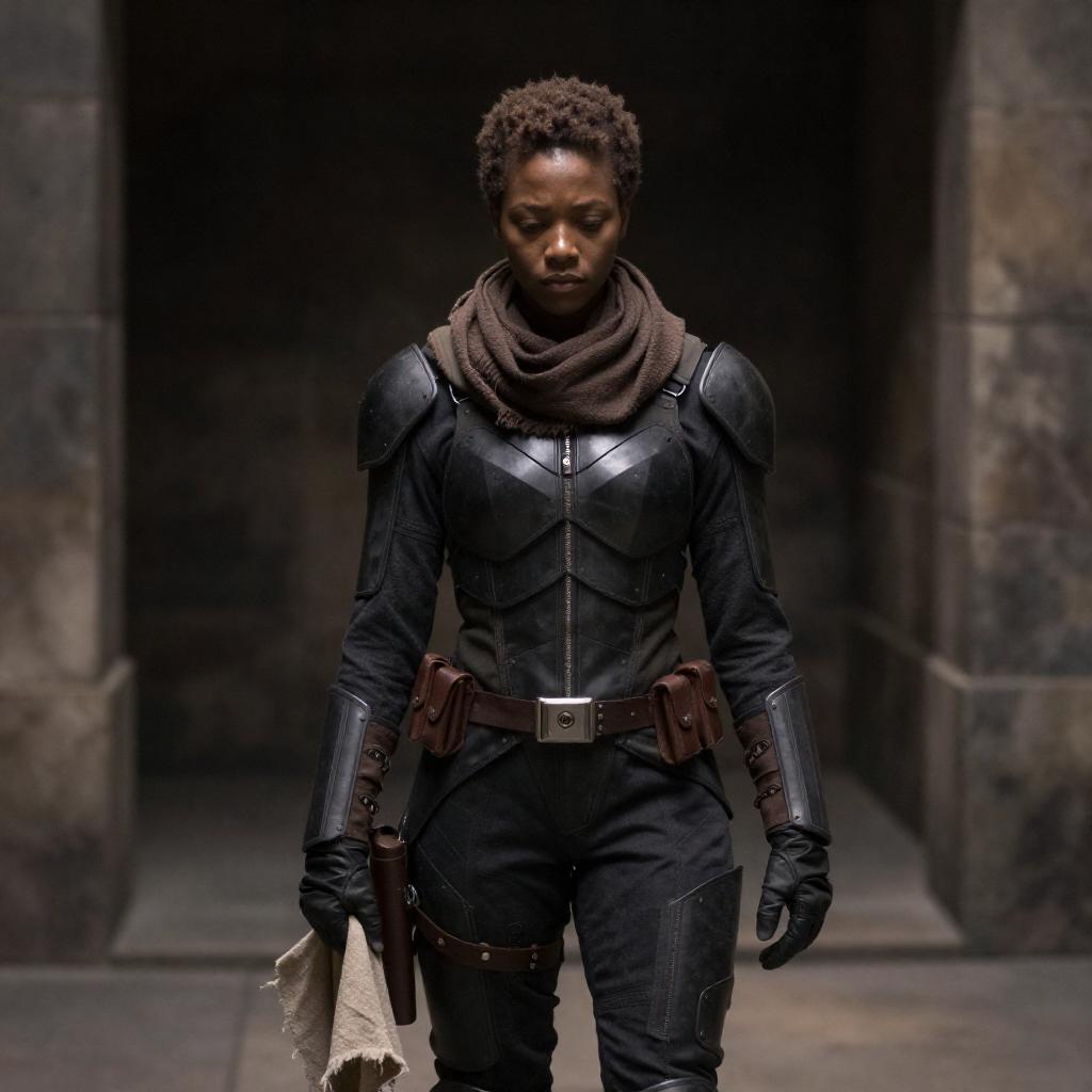 Photograph of a dark-skinned woman with short curly hair, wearing a brown scarf, black armored suit, and gloves, standing in a dimly lit, narrow, stone corridor. She looks downward with a somber expression, holding a tattered cloth in her right hand. The background is shadowy, with ured stone walls.