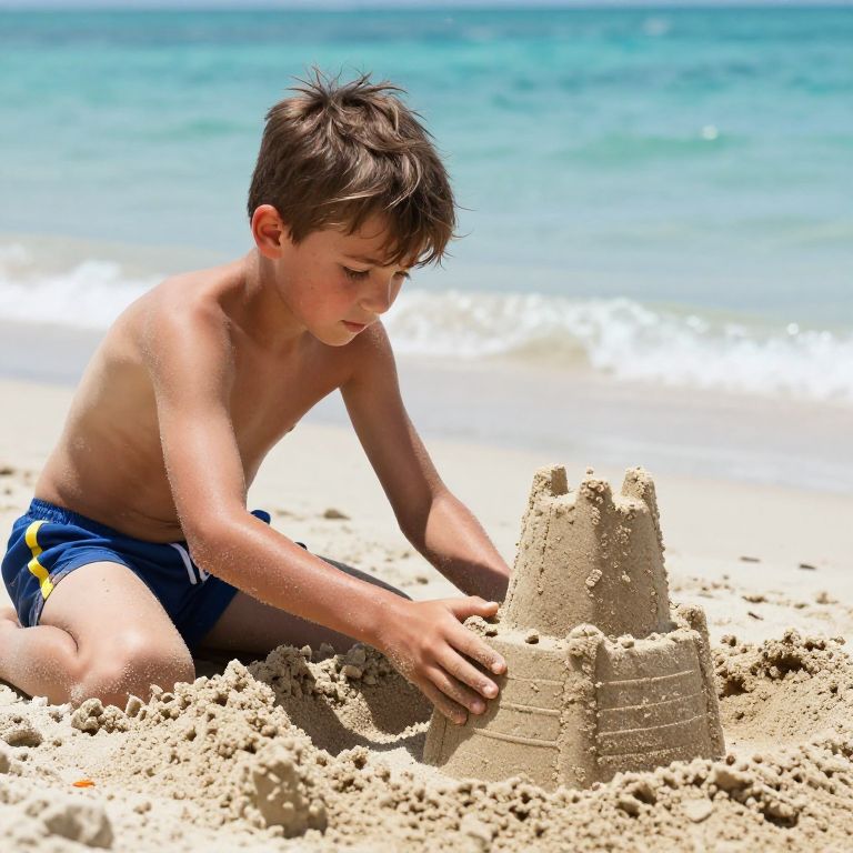 Shirtless boy at beach, building sandcastle, focused expression, detailed sand textures, turquoise water in background, sunny day, casual summer vibe, dynamic natural composition