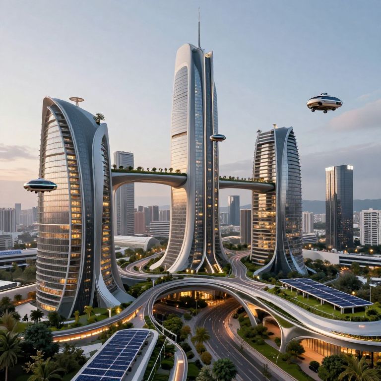 Photograph of a futuristic cityscape at dusk featuring three towering, curved skyscrapers with illuminated windows and sleek, silver exteriors. The buildings are interconnected by elevated walkways and have modern, aerodynamic designs. Two flying cars hover in the sky, while a network of illuminated, curved roads snakes through the base of the structures. Solar panels are visible on rooftops, and greenery is interspersed among the buildings. The background includes a hazy skyline with additional high-rises. The overall scene is vibrant, with a mix of natural and futuristic elements, emphasizing advanced urban planning and technology.