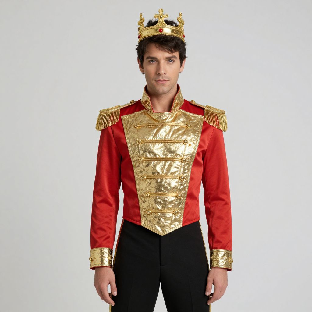 Photograph of a young man standing against a plain white background. He has dark brown hair, light skin, and green eyes, wearing a golden crown with red gems. He is dressed in a regal red military-style jacket with gold epaulettes and intricate gold detailing on the front and cuffs, paired with black pants. The jacket's design features a high collar and buttons down the center. His expression is neutral, and he stands with his arms slightly down by his sides. The overall style is formal and royal, reminiscent of a king or noble.