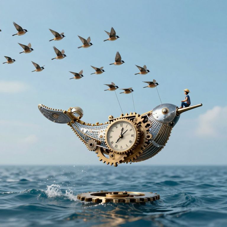 A clockwork whale glides silently through a sky ocean, propelled by synchronized flocks of sparrow engines, guided by a tiny sailor sitting on a floating gear.