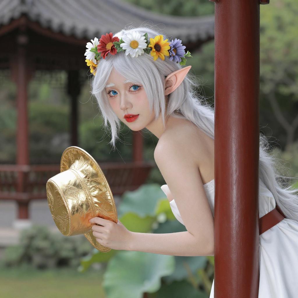 A digital CGI image of a nude, white-haired elf woman with pointed ears, wearing a flower crown, leaning forward over a red pole. She holds a golden hat in her right hand. Her fair skin contrasts with the lush green garden background, which includes a wooden structure with a gray roof. Her red lips and blue eyes are visible as she looks over her shoulder.
