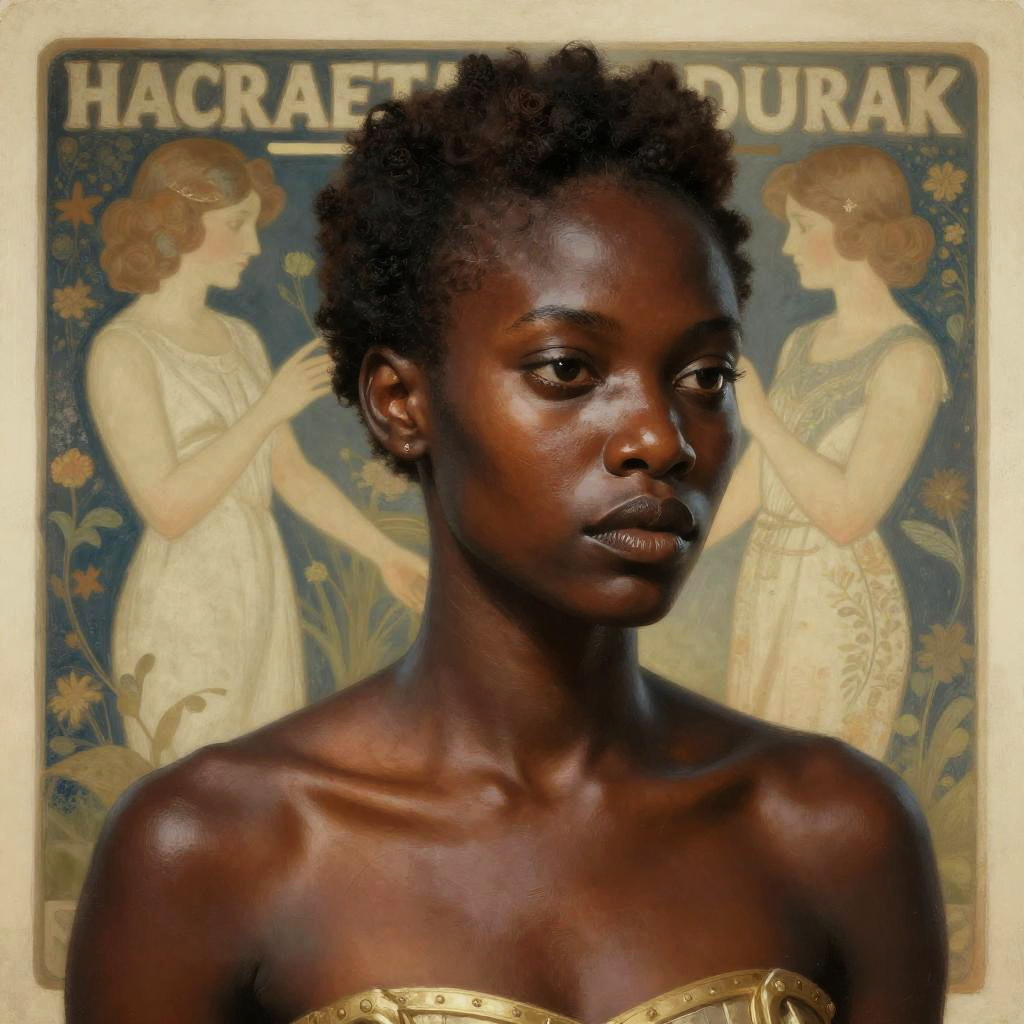 Photograph of a dark-skinned African woman with short, natural curly hair and a serious expression, wearing a gold, strapless top. She is centered in the foreground against a vintage-style, blue and gold Art Nouveau poster featuring two white women in flowing, white dresses with floral patterns, standing in profile and facing each other. The poster text "HACRÆTIA" is prominently displayed at the top. The woman's smooth, shiny skin contrasts with the textured, detailed background. The image blends realism with the stylized, decorative elements of Art Nouveau.