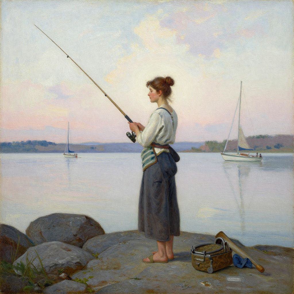 A serene oil painting by Georges d'Espagnat depicts a woman standing on a rocky shoreline, fishing with a calm, contemplative demeanor against a backdrop of a tranquil lake, sailboats, and a soft, impressionistic sky.