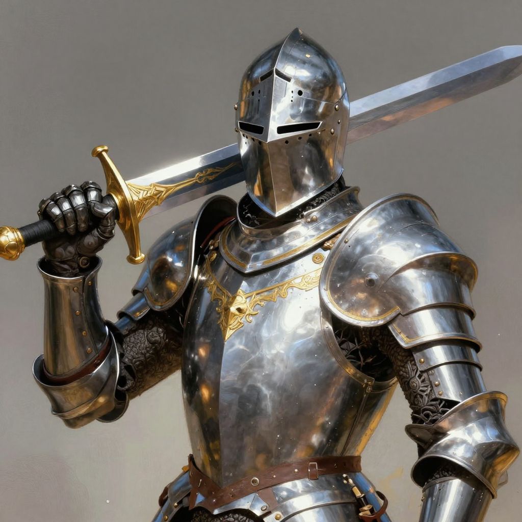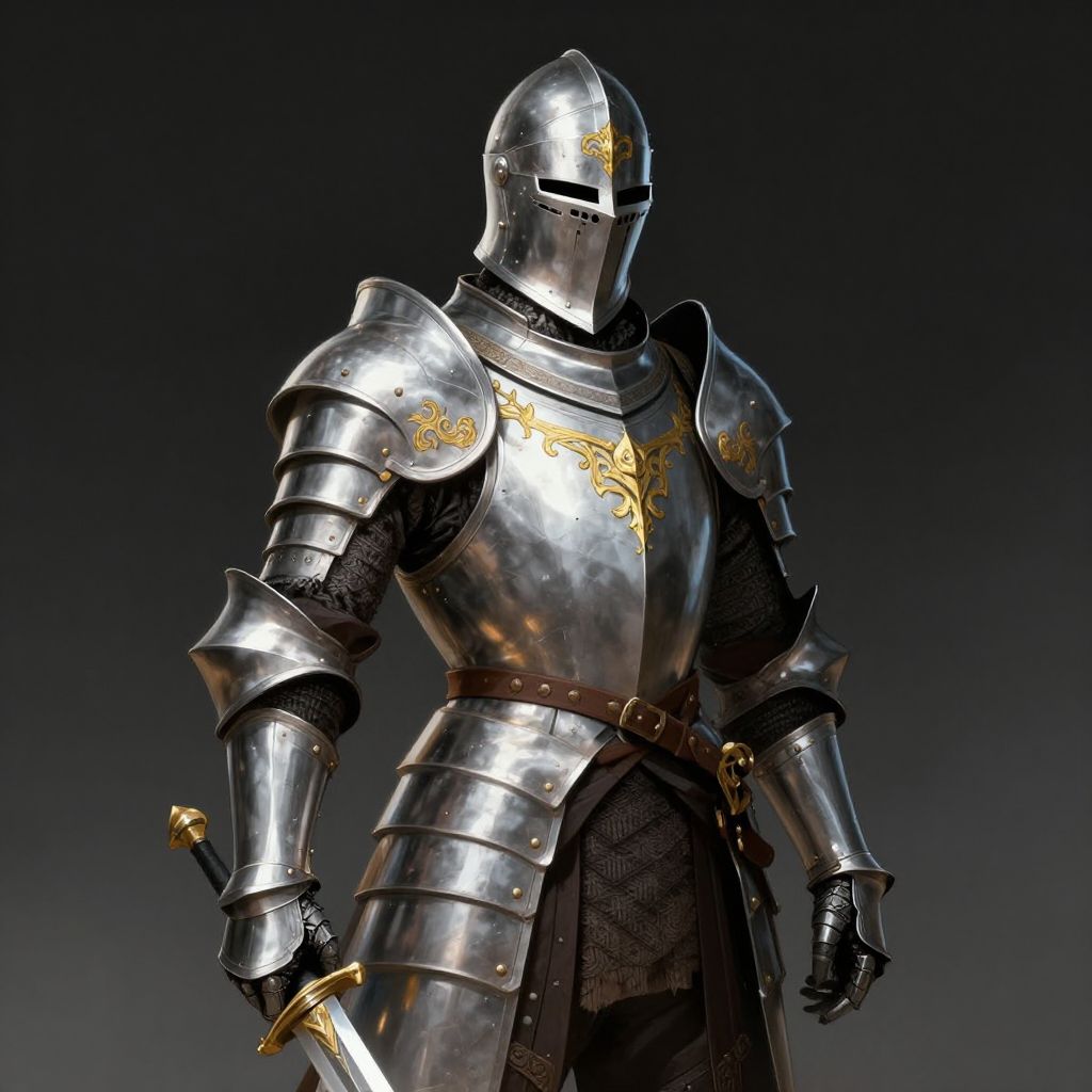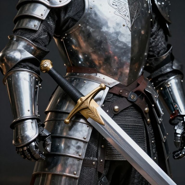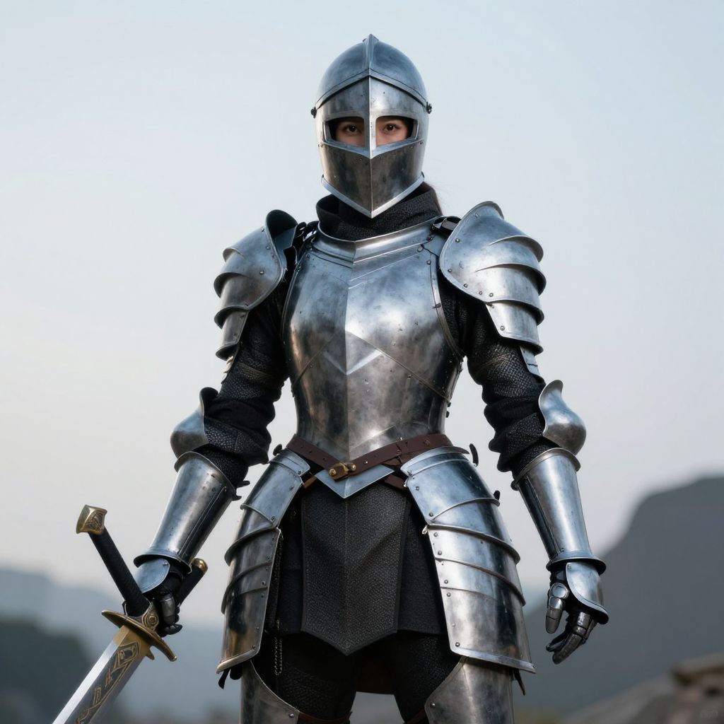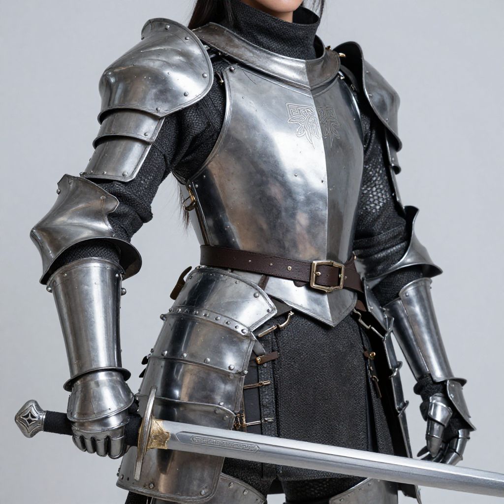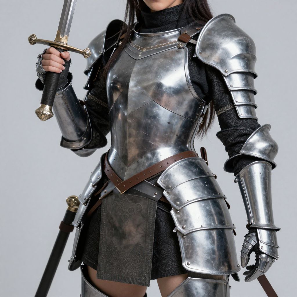 Photograph of a woman in full medieval-style silver armor, holding a sword with a golden hilt in her right hand. Her long dark hair flows over her shoulders. The armor includes shoulder guards, a breastplate, and arm guards, with black fabric visible at the waist and legs. A brown leather belt with a silver buckle is worn over the armor. The background is a plain, light gray, highlighting the shiny, reflective metal of the armor. Her left hand rests on her side, gripping a sword's hilt. The overall image conveys a sense of readiness and strength.