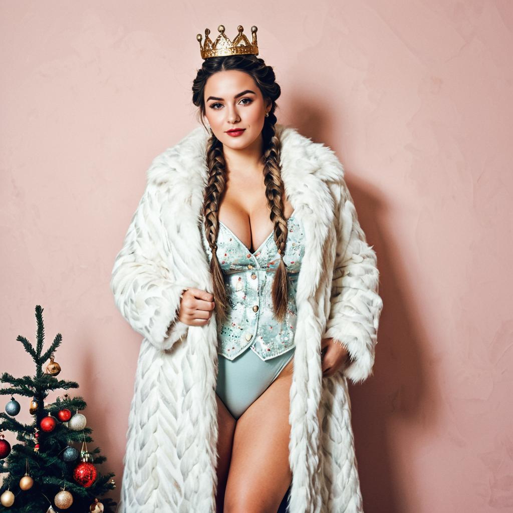 Portrait of a confident woman wearing a white faux fur coat over a pastel floral corset bodysuit. She has long braided hair styled in twin braids and wears a golden crown on her head. A small decorated Christmas tree is visible beside her against a light pink background.