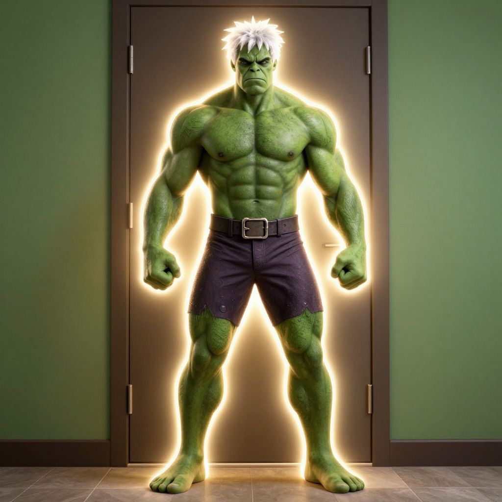 Photorealistic CGI image of a muscular, green-skinned Hulk-like creature standing in front of a dark brown door. The creature has wild white hair, a scowling face, and is wearing dark blue shorts with a black belt. His body is glowing with a bright, yellow-white light that outlines his massive, defined muscles. The green skin has a textured, slightly rough appearance. The background is a simple green wall with a tiled floor visible at the bottom. The door has metal hinges and a simple design, contrasting with the Hulk's imposing presence.