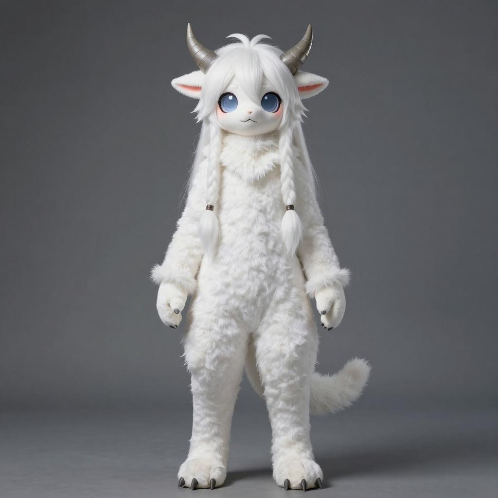Photo-realistic cosplay photo of person in muppo costume. Full body. Standing. Full length. 1girl, horns, tail, hair between eyes, solid circle pupils, long hair, sidelocks, collar, mittens, professional photoshoot