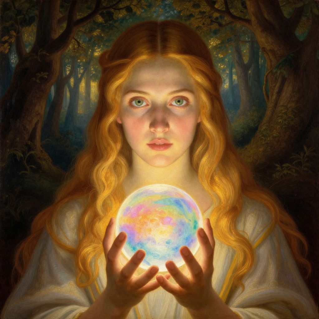 Create an enchanting portrait in the Renaissance oil painting style, depicting a young woman with captivating green eyes and radiant golden hair against a mystical forest background. Ethereal light filters through ancient trees, illuminating her enigmatic expression as she gently holds a luminous orb between her hands. The orb's translucent surface pulses with a vibrant spectrum of colors that mirror the emotional depth of the scene. Warm, golden lighting interplays with cooler forest tones to create an alluring atmosphere, evoking a sense of wonder, curiosity, and introspection within this mesmerizing portrait.
