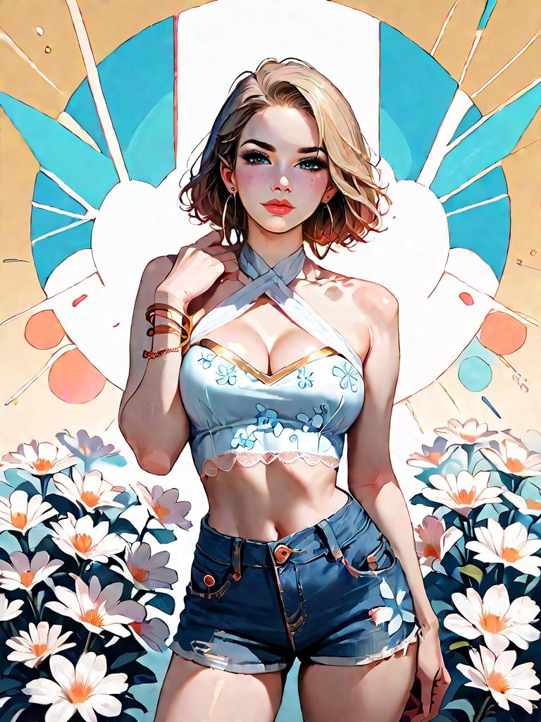 Digital art of a woman with white hair wearing a two-piece sporty bikini in pastel blue and coral colors with white trim. She is standing against a bright blue sky and ocean background, surrounded by vibrant pink and orange flowers. The bikini has a scoop neck top with thin straps and low-rise bottoms. The scene has an artistic, realistic style with a summery, beach vibe.