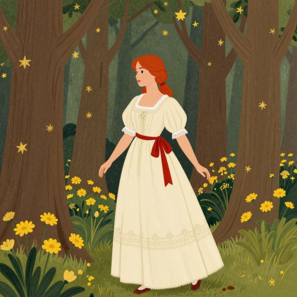 Illustration of a serene young woman with vibrant red hair in a cream-colored dress with lace details and a red sash, standing gracefully in a forest. The scene features tall trees decorated with glowing golden stars and blooming yellow flowers on the forest floor, evoking a magical, fairy-tale atmosphere.