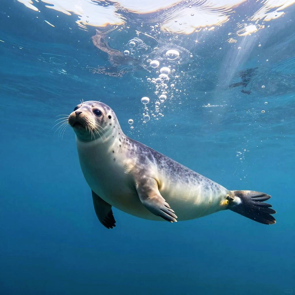 A cute harp seal swimming playfully underwater with crystal-clear turquoise ocean waves, bubbles and rays of sunlight filtering down, sleek white fur contrasting with blue hues, dynamic and lively nature illustration with realistic textures.