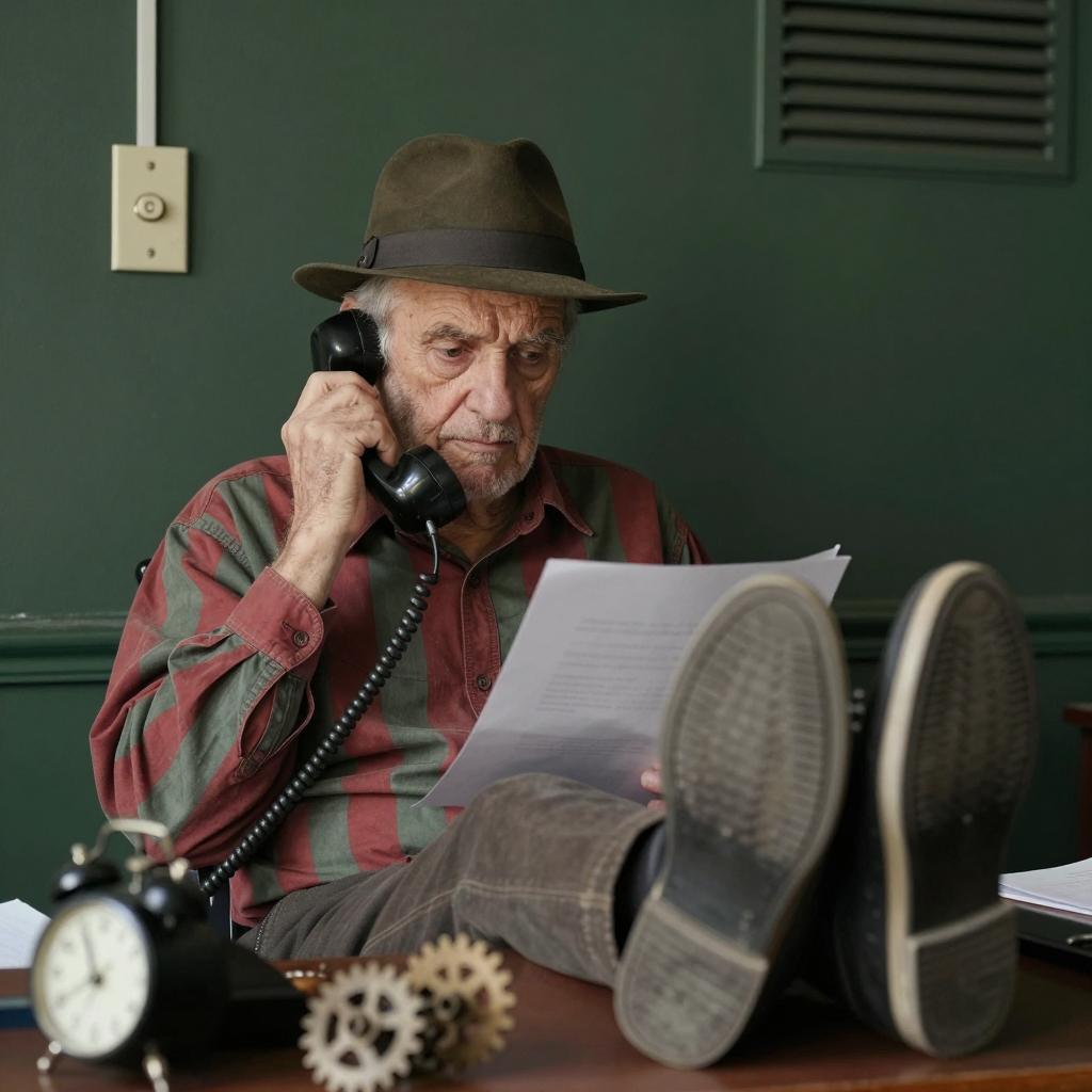 Old man with gray hair and beard, wearing a white shirt, sitting at a desk, looking at a vintage typewriter. Dark room with patterned walls, framed pictures, and a clock in the background. Glass reflection shows part of his face. Typewriter on left, vase on top. Right side has a small table with glass containers.