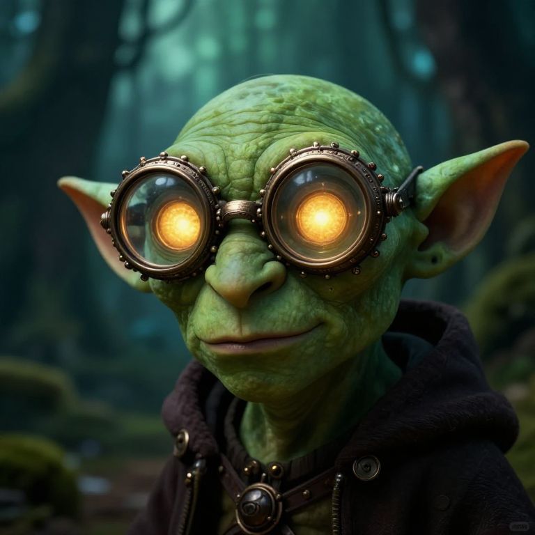 Goblin glasses perched on a mischievous green goblin's nose, intricate steampunk design with glowing lenses, fantasy forest background, cinematic lighting