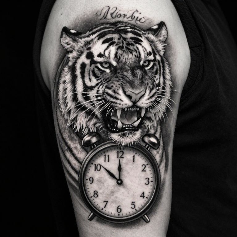 Establishing Shot tattoo design for a roaring tiger and clock blend in the style of black and white realism,