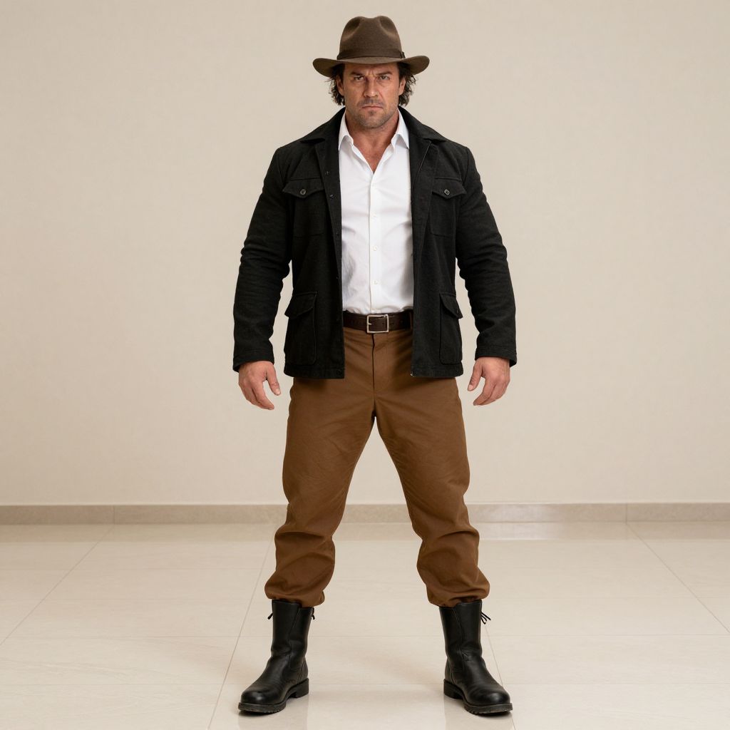 Photograph of a muscular man with curly hair, brown hat, black jacket, white shirt, brown pants, black boots, standing confidently against a plain