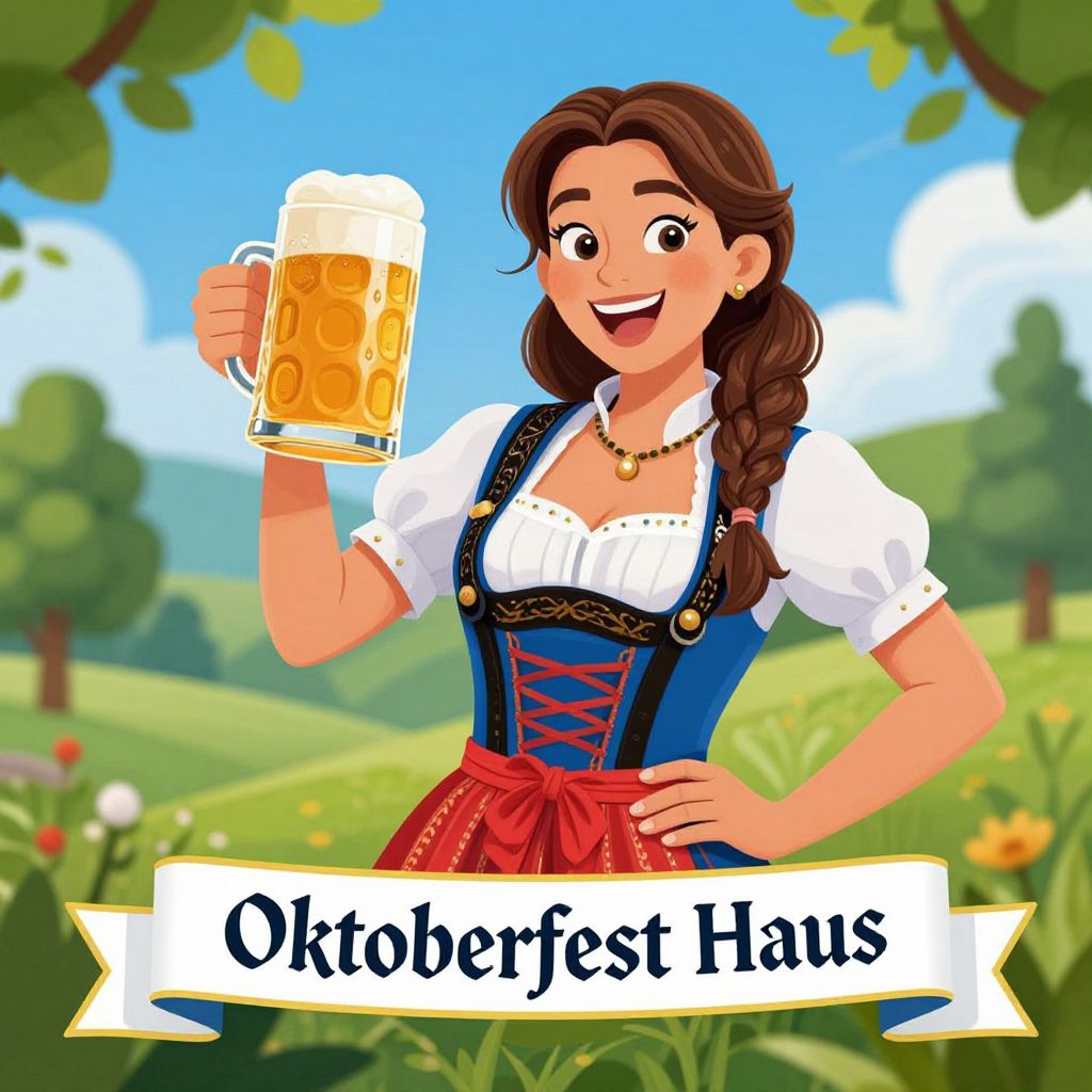 A vibrant cartoon-style illustration featuring a cheerful woman in traditional Bavarian attire holding a stein of beer, set against a scenic backdrop of greenery and blue skies, with the text \"Oktoberfest Haus\" displayed on a ribbon below, capturing the festive spirit of Oktoberfest in a high-definition, digitally rendered design.