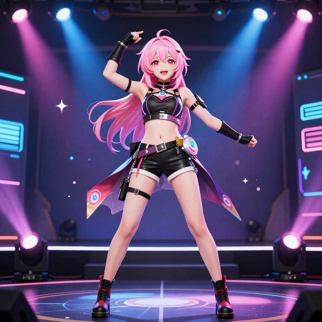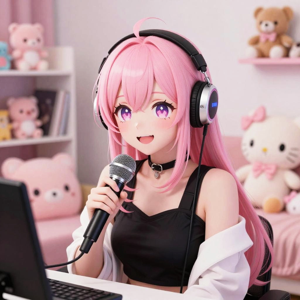 Pink hair vtuber with futuristic cyberpunk style, glowing neon lights in the background, wearing high-tech headphones and a sleek outfit, expressive anime eyes, vibrant and energetic digital art, vivid color palette