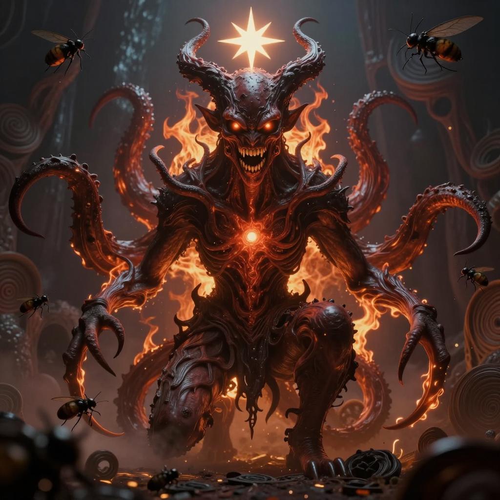Futuristic Satan, fire, tentacles, Psychedelic, rows of teeth, ominous eyes, high quality, digital art, spirals, insects, post apocalyptic, textured acrylic, dark fantasy, dark surrealism, evil, volumetric lighting, detailed, intricate, complex, anti-cosmic, Maya, octane, fusion, cgsociety, zbrushcentral, light dust, dynamic lighting, glowing, global illumination, lumens, 3d Studio Max, lightwave 3D, cgi, hellish, ominous, evil aura, the morning star, satanic, Satanism, full body perspective, head to toe angle, ultra detailed background, 8k, depth of field, occult,