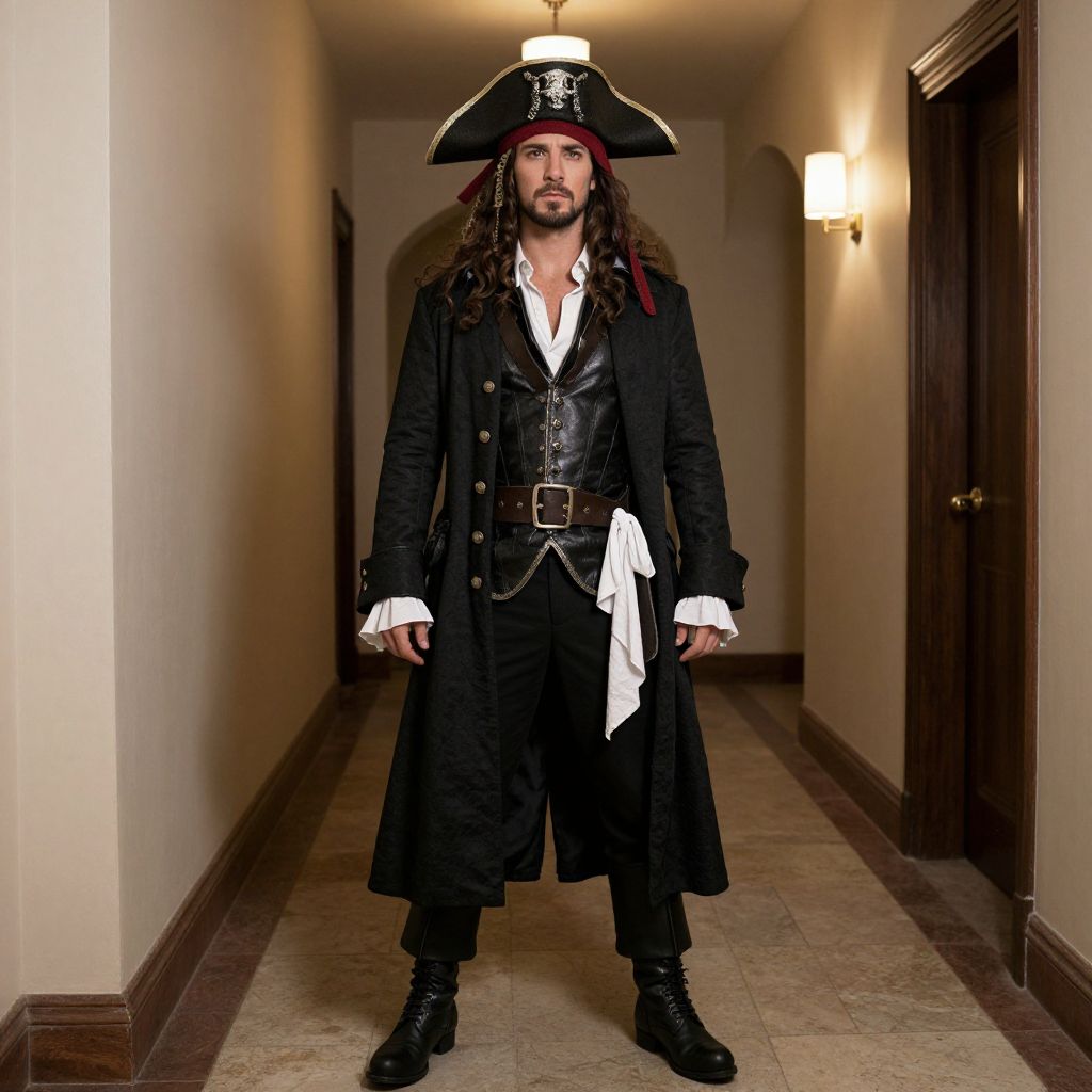 Expensive Pirate Costume, pirate in a black coat and red hat standing in a hallway